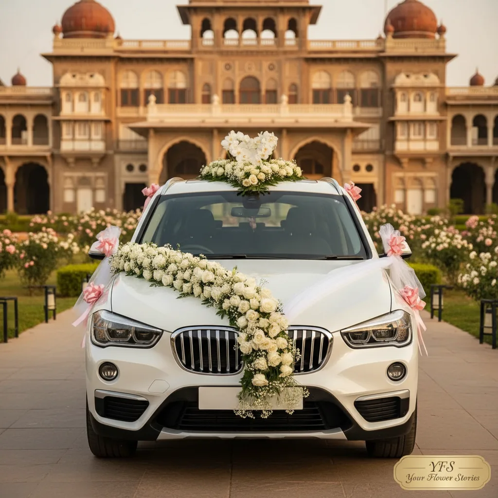 Celebrate your wedding with our premium car decoration featuring elegant white roses and delicate accents. This design perfectly complements the luxury of your BMW X1, creating a memorable experience.